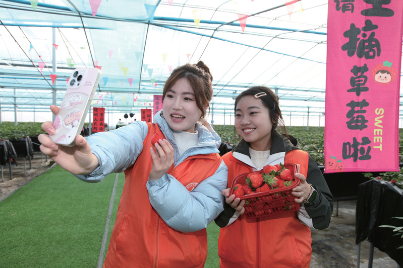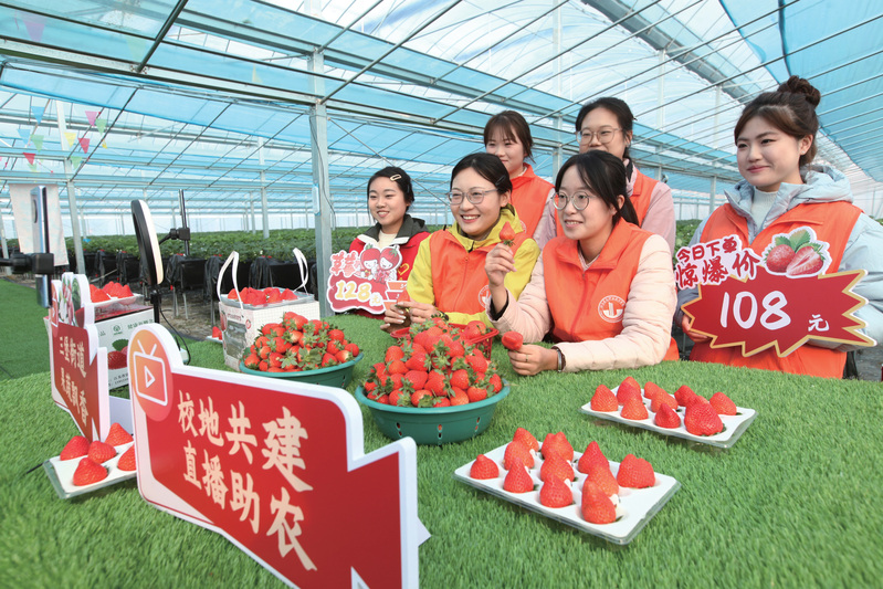 12月17日,江苏美狮贵宾会技术学院经济管理学院电子商务专业的学生在徐州市铜山区三堡街道一农场直播销售草莓。近年来,该校与三堡街道开展校地共建,为大学生搭建社会实践平台,借助电商平台助力地方农产品销售。(蒯创 摄)